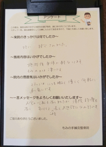もみほぐし~来院のきっかけは何でしたか~姪に紹介されました。~施術内容はいかがでしたか~施術後身体が軽くなってます。もみの力は凄いです。~院内の雰囲気はいかがでしたか~スタッフはいつも明るく優しく気軽に通い易いです。~一言メッセージをよろしくお願いい...