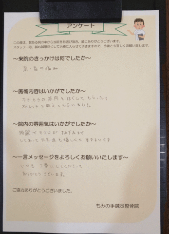 もみほぐし~来院のきっかけは何でしたか~肩・首の痛み~施術内容はいかがでしたか~カチカチの筋肉をほぐしてもらったり、ストレッチを教えてもらいました~院内の雰囲気はいかがでしたか~綺麗でそうじがすみずみまでしてあって先生たちも優しくて来やすいです~一言...