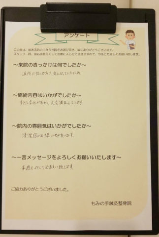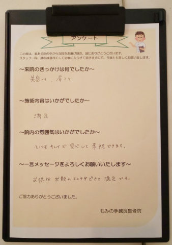 もみほぐし~来院のきっかけは何でしたか~近所に住んでおり、気になっていたため。~施術内容はいかがでしたか~すぐに変化がわかり、大変満足しています。~院内の雰囲気はいかがでしたか~清潔感があり居心地が良いです。~一言メッセージをよろしくお願いいたします...